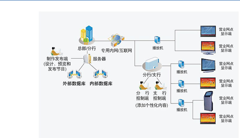 系統中心服務器端采用 B/S 架構,以總部為中心,二級地區機構設立二級服務器,授權分區管理,網點建立 C/S 架構播放終端。