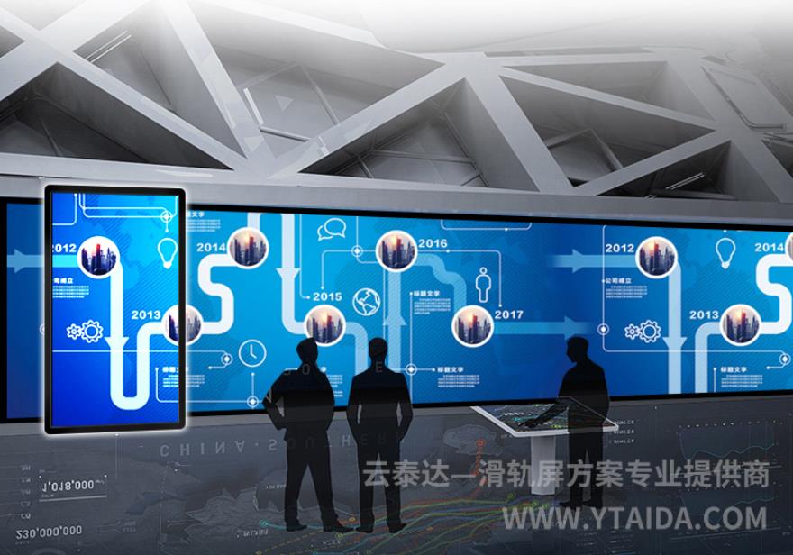 2、互動滑軌屏設備主要有定制滑行軌道、等離子電視、紅外傳感器、燈箱、計算機組成。在類似坐標軸的展墻上鑲嵌各種案例圖片,同時制作一組可滑動的機械結構以懸掛液晶電視。