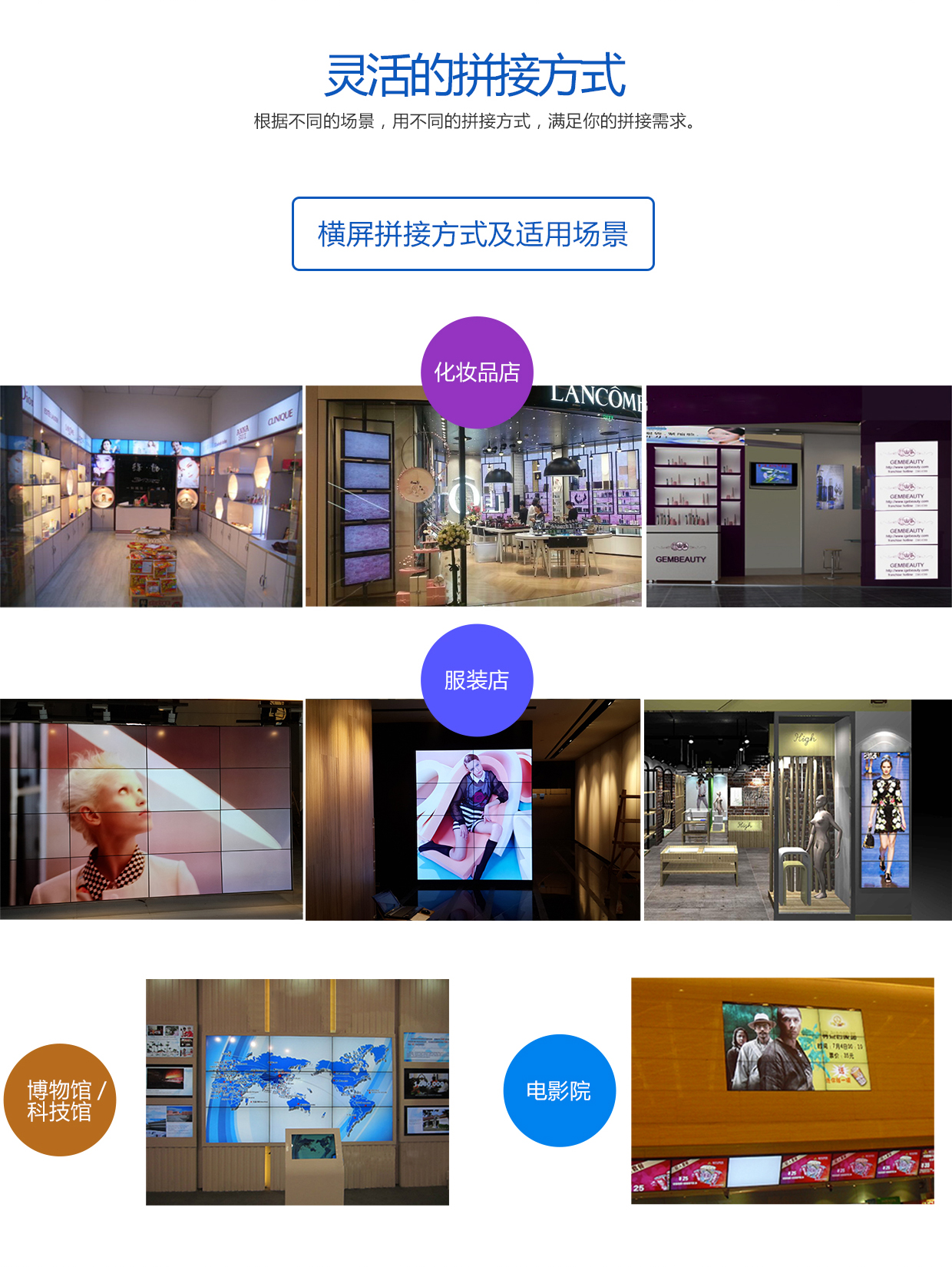 靈活的拼接方式 根據(jù)不同的場景,用不同的拼接方式,橫屏拼接及適用場景 豎屏拼接及適用場景 橫豎屏組合異形拼接及適用場景,滿足您的拼接需求。